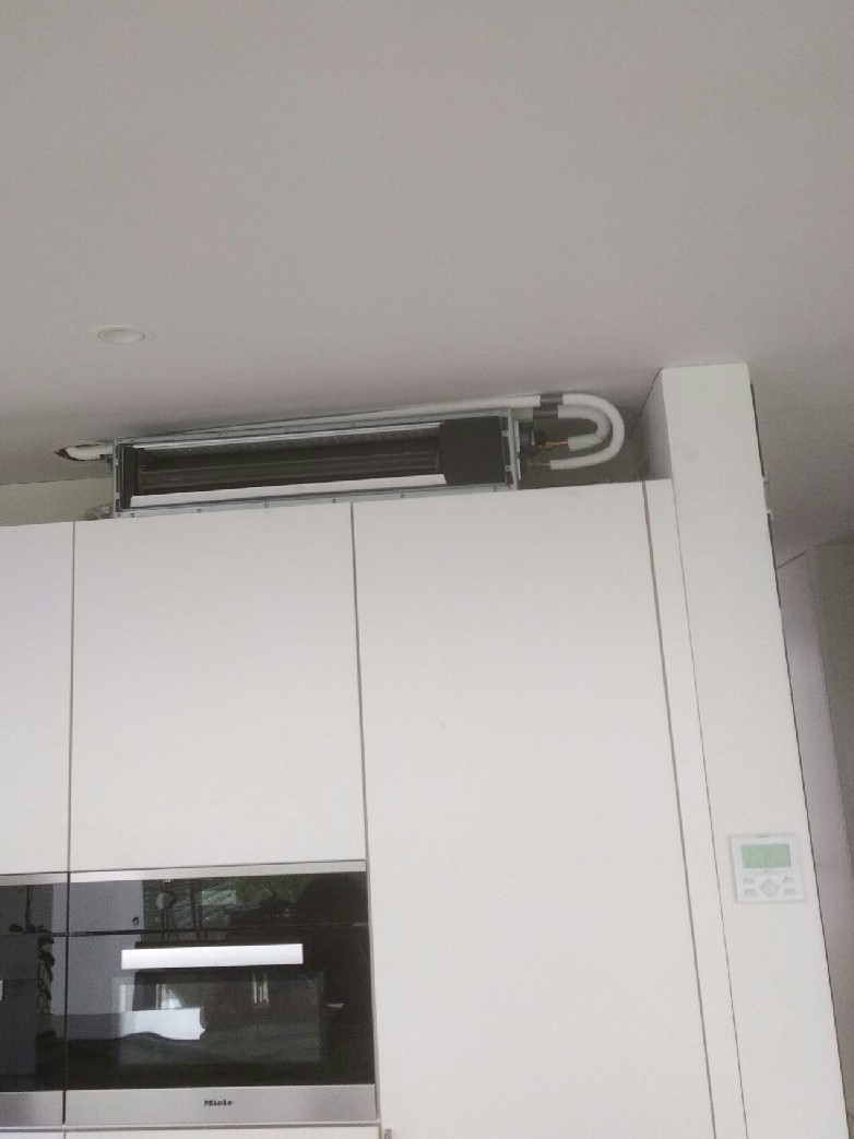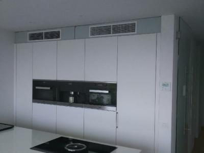 Project CJ: koelen van een leefruimte in een appartement met een split combinatie ingebouwd in een keukenkast, de buitengroep mooi ingewerkt in een houten omkasting op het terras